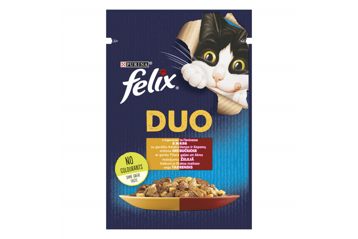Консервы Felix Fantastic Duo изготовлены из высококачественных ингредиентов. Нежные кусочки, которые отлично сочетают в себе два мясных вкуса индейки и печени в желе. Благодаря этому, теперь Ваша кошка может наслаждаться двумя вкусами одновременно!