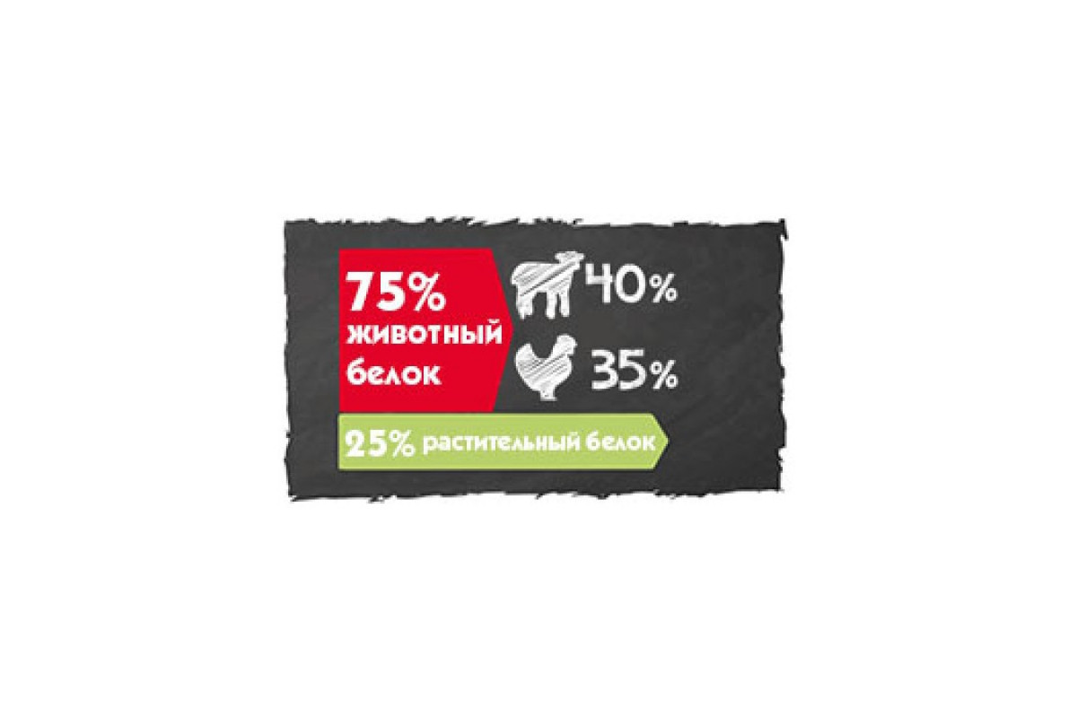 Анализ: Протеин – 23%, жир – 12,5%. Источники белка: животный белок – 75% (мясо птицы – 35%, ягнятина – 40%), растительный белок – 25%.