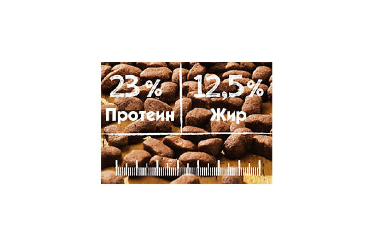 Анализ: Протеин – 23%, жир – 12,5%. Источники белка: животный белок – 75% (мясо птицы – 35%, ягнятина – 40%), растительный белок – 25%.