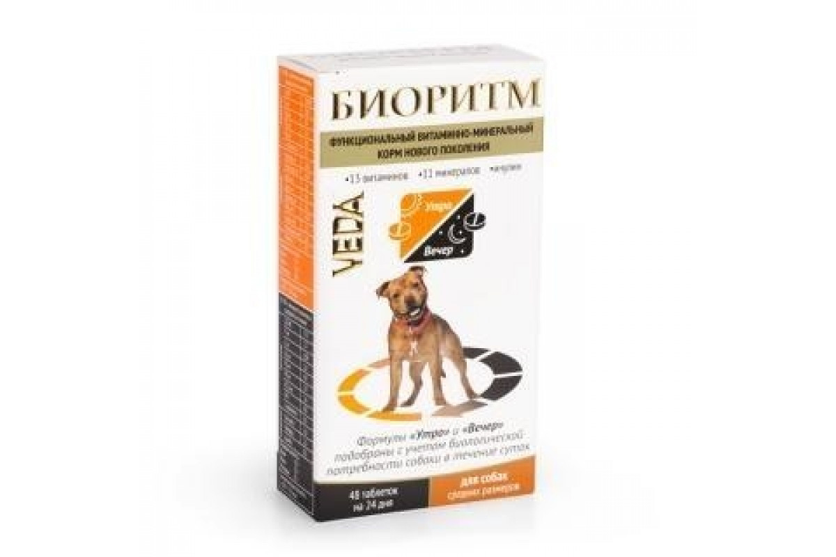 витаминно-минеральный комплекс БИОРИТМ является функциональным (оздоровительным) кормом нового поколения. Содержит полностью усваиваемые формы витаминов и микроэлементов, разделенные на 2 приема, которые удовлетворяют суточную потребность взрослой собаки массой 10 — 30 кг, вне зависимости от вида питания.