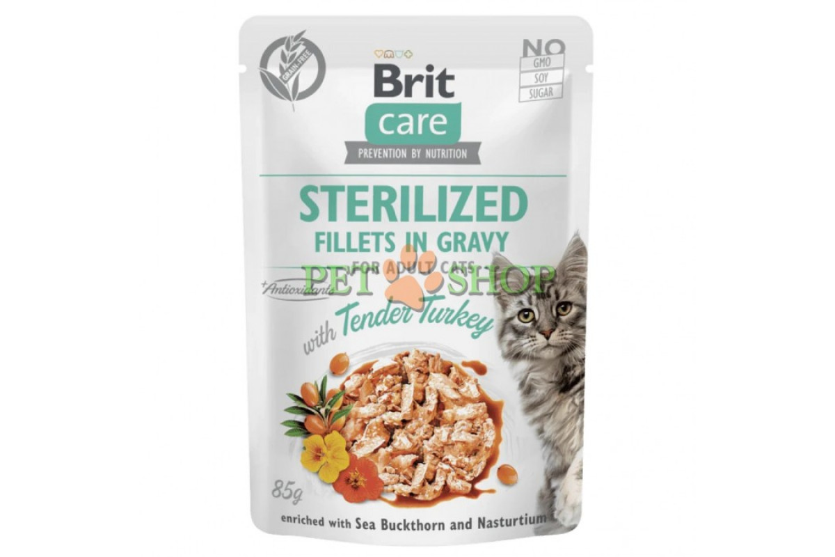 Кошка Brit Care стерилизована. Филе в соусе с нежной индейкой, обогащенное облепихой и настурцией.