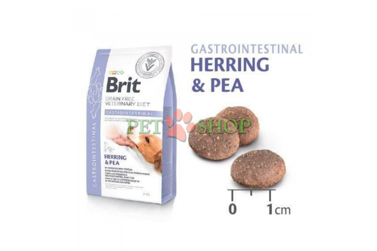 Brit Vet Dog Gastrointestinal Hering, Pea — беззерновая диета при острых и хронических гастроэнтеритах с сельдью, лососем, горохом и гречихой. Диетический полнорационный корм сухой для щенков и взрослых собак – снижение острых расстройств кишечника, профилактика нарушения пищеварения.