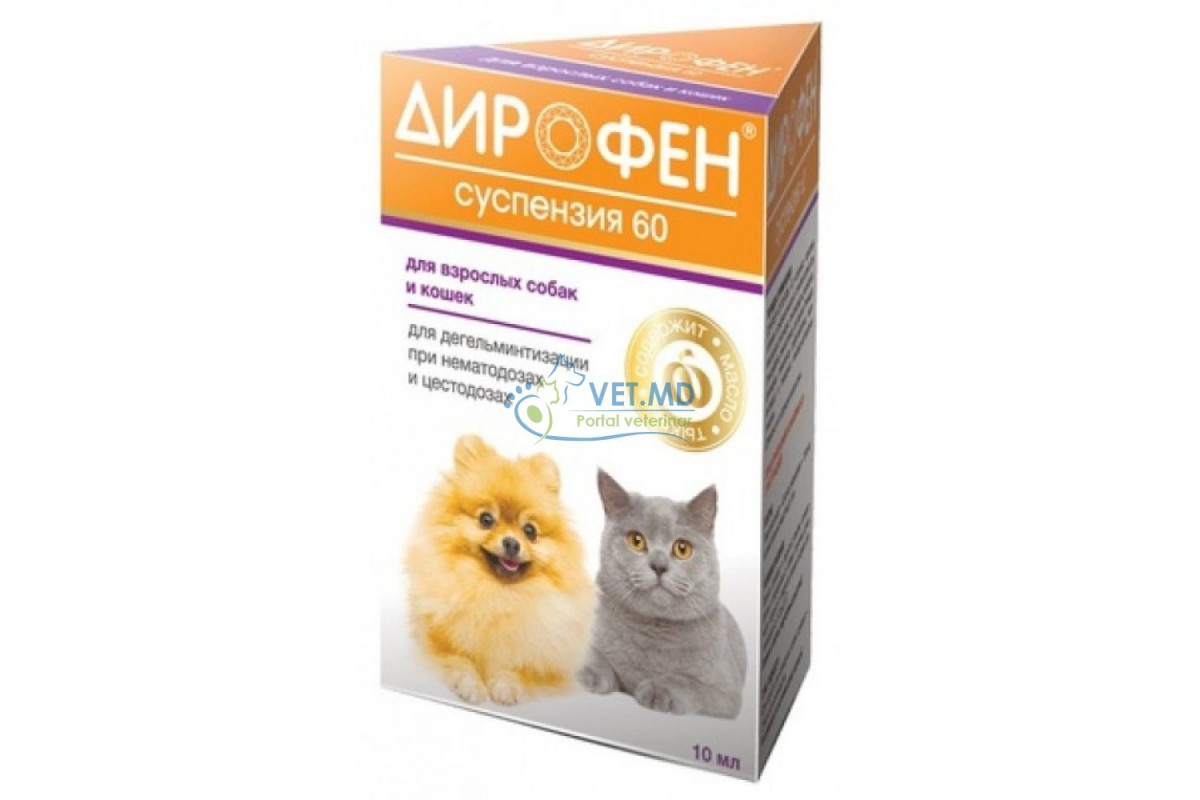 Дирофен-суспензию 60 - взрослым собакам с профилактической и лечебной целью при нематодозах (токсокароз, токсаскаридоз, унцинариоз, трихоцефалез, анкилостомоз), цестодозах (тениидоз, дипилидиоз, эхинококкоз, дифиллоботриоз, мезоцестоидоз) и смешанных нематодо-цестодозных инвазиях.