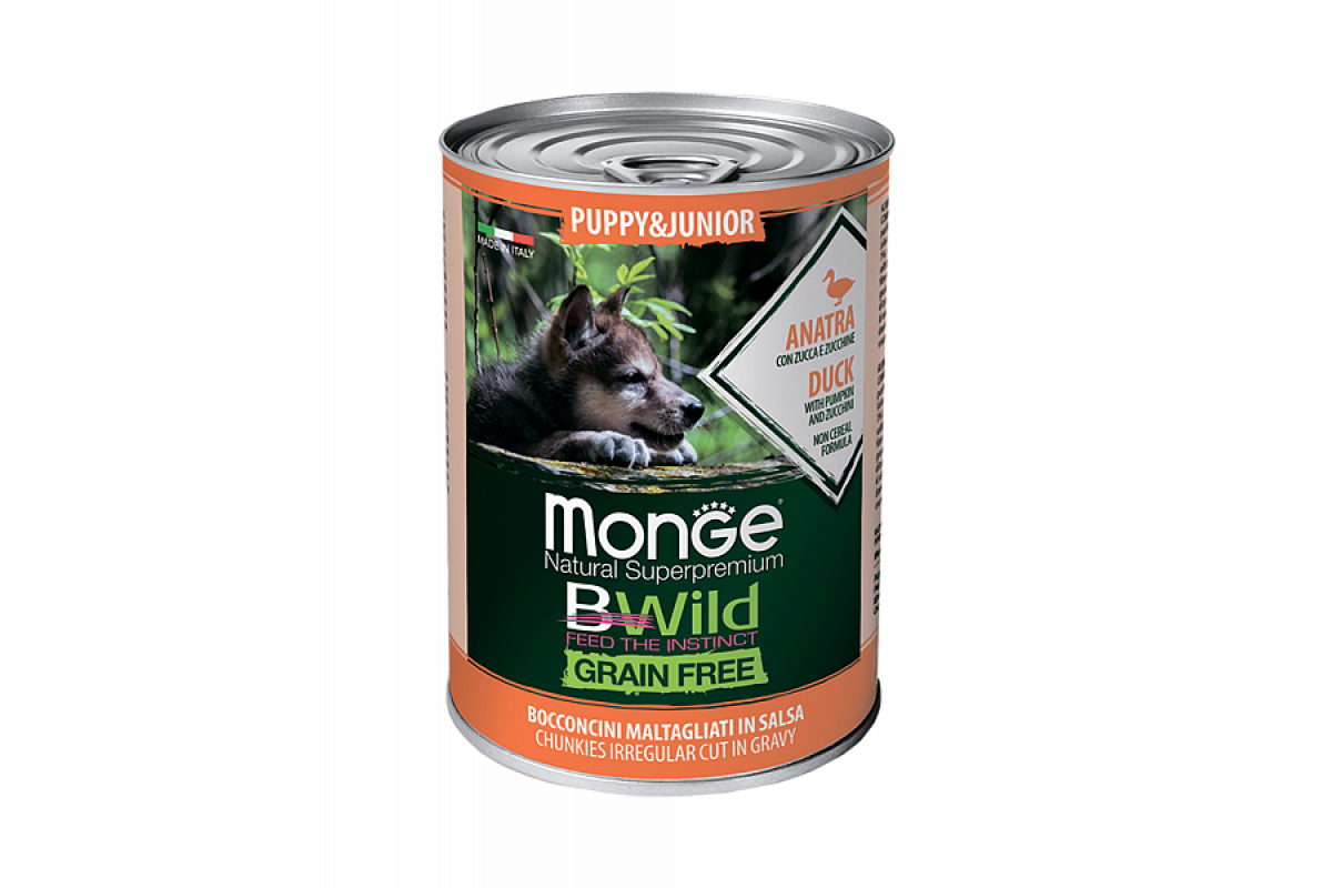 MONGE GRAIN FREE PUPPY&JUNIOR с уткой, тыквой и кабачками – это полноценный сбалансированный рацион для щенков. Обеспечивает высококачественное питание щенков в возрасте от 1 до 12 месяцев. Разработан с использованием альтернативных источников углеводов, таких как, тыква и кабачок.