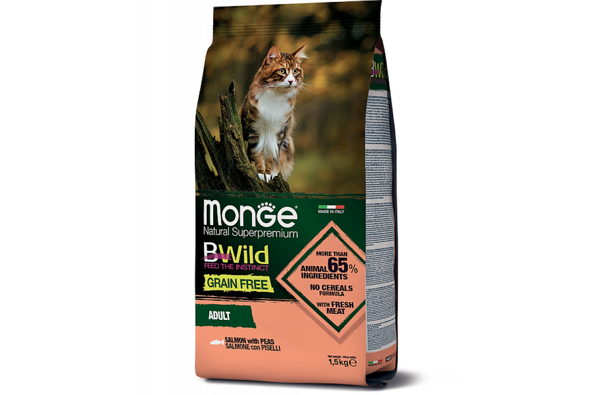 Monge BWild Cat GRAIN FREE SALMONE/PEAS — это полноценный сбалансированный рацион из лосося и гороха, который разработан с учётом физиологических особенностей взрослых кошек. Идеально подходит в качестве повседневного рациона для домашних питомцев. Высокий уровень белка в составе корма и содержание в нем L-карнитина позволяет кошке долгие годы сохранять активность и хорошую физическую форму. Содержит важнейшие антиоксиданты, такие как витамин Е.