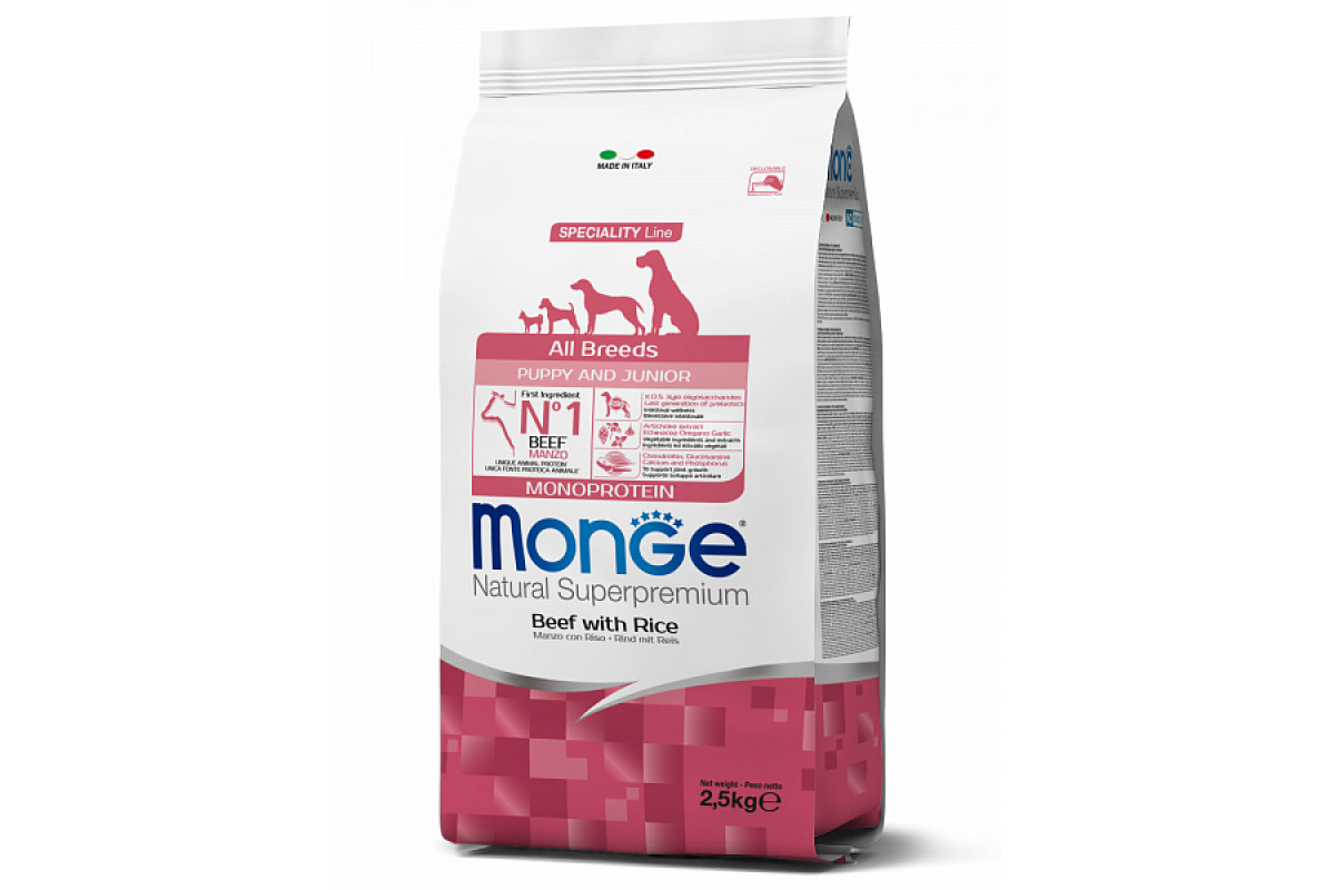 Monge Natural Superpremium All Breed Monoprotein для щенков и юниоров c говядиной с рисом – это полноценный корм для щенков любого размера.