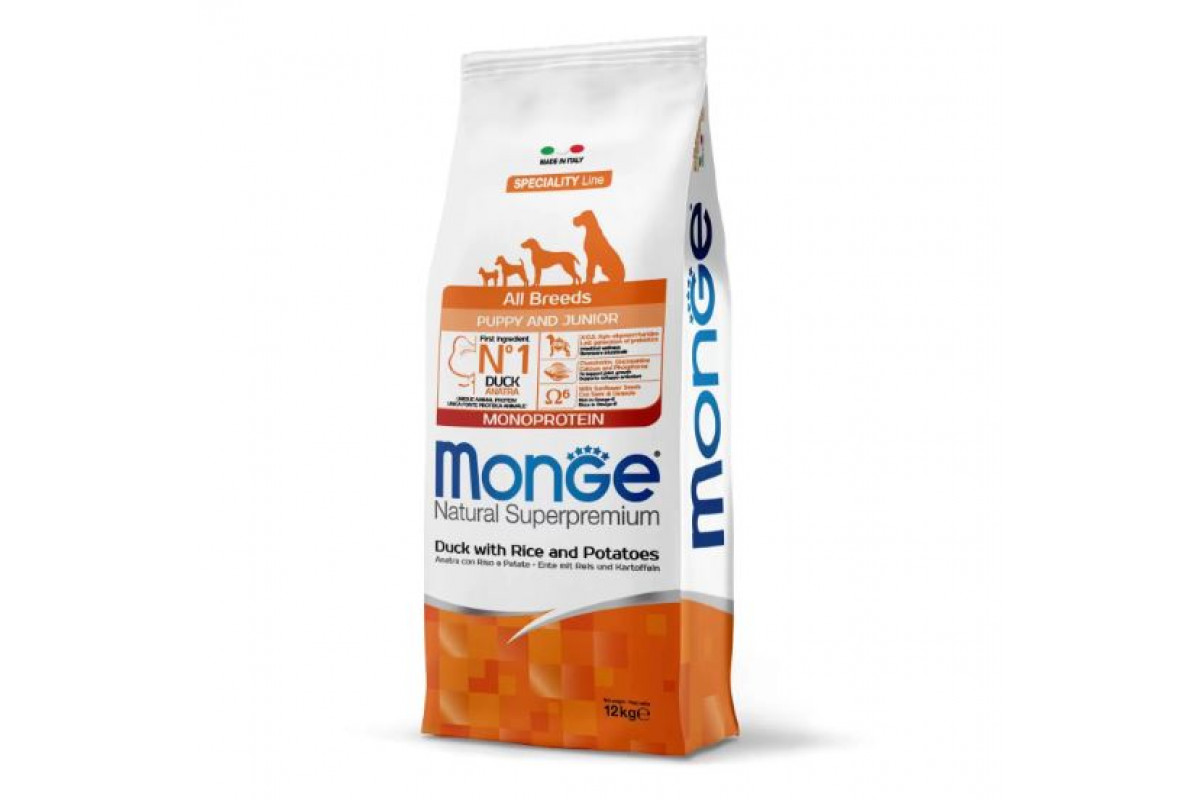 Monge Natural Superpremium Puppy and Junior Monoprotein Duck with Rice and Potatoes — это полнорационный корм с уткой. рисом и картофелем для щенков любого размера.