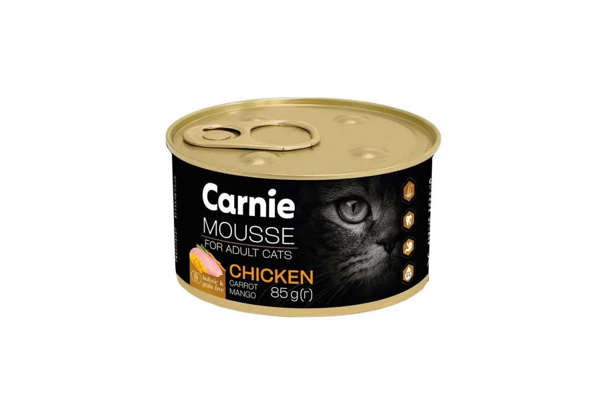 Влажный корм для кошек Carnie — мусс с курицей, манго, морковью и желе, 85 г — это нежный полнорационный рацион для взрослых кошек, сочетающий питательность и изысканный вкус. Воздушная текстура мусса в сочном желе легко усваивается и нравится даже самым привередливым питомцам.